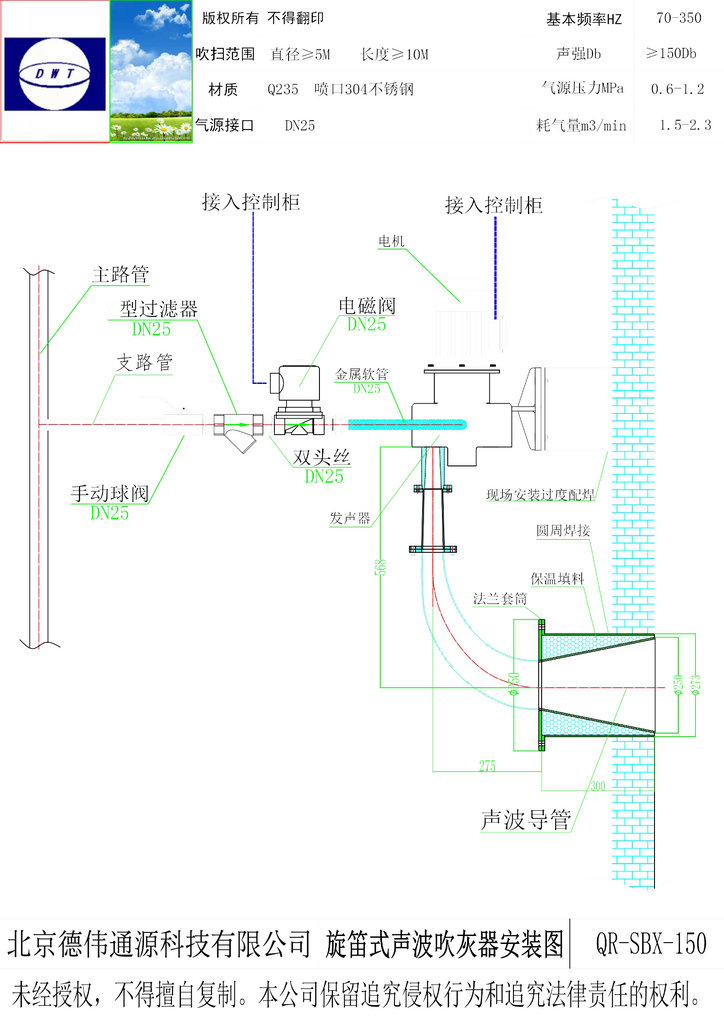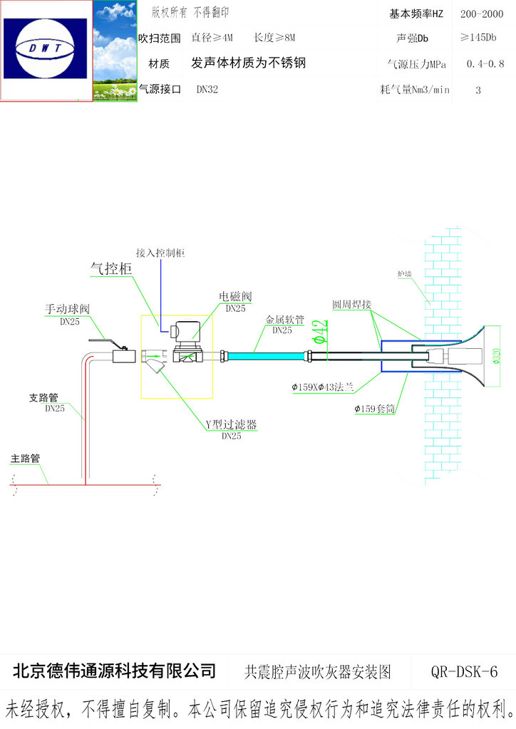 3、发射器喷嘴采用耐腐蚀耐高温材料,能够保证其在高温区可靠运行,定向曲型设计,使脉冲气流准确作用于积灰部位。